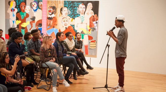 Recent high school graduates Rumaisha and Kelsey spent much of the past two years at the Nasher Museum of Art at Duke University. As original members of the Nasher Teen Council (NTC), they led public programs, installed exhibitions, met artists, and created their own art. Their quotes are from artist talks they gave this month at an exhibition of work by the teens at a downtown gallery. Paintings and collages from the exhibition Nina Chanel Abney: Royal Flush inspired much of their work.