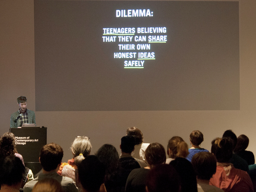 The Curriculum Slam! has become a popular yearly feature of the MCA’s teacher programming since 2010. Teachers have presented on a wide range of topics—using the work of contemporary artists to inspire contemporary curriculum. Presentation subjects have ranged from 5th graders making paintings with the self-imposed limitations (based on the work of Matthew Barney), building and photographing miniature environments (in the style of artists such as Laurie Simmons and outsider artist Mark Hogancamp), humorous horror drawings (inspired by drawings and animation of Tim Burton) and explorations of self-identify in the digital age in which students’ text messages contribute to making self-representations.