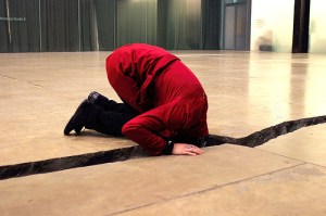Visitor interacting with Doris Salcedo’s “Shibboleth” at the Tate Modern. Photo by truu.