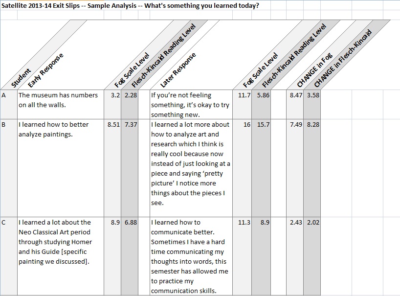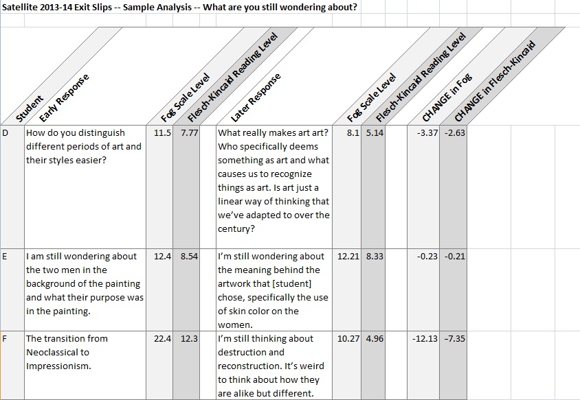 As the year went on, I noticed that the teens ‘ responses were growing more sophisticated: they were longer, they used more art vocabulary, and they realized that they might not be able to answer questions definitively, if at all. At the suggestion of Marianna Adams, who specializes in museum research and evaluation, I tried running these responses through two readability tests to see if that would quantify the sophistication of these responses. One test produces the sample’s Fog Scale Level, which measures syllable count and sentence length (a score of 5 being readable, 20 being very difficult). The other was for the Flesch-Kincaid Grade Level, which approximates the average grade level necessary to read and understand the text.