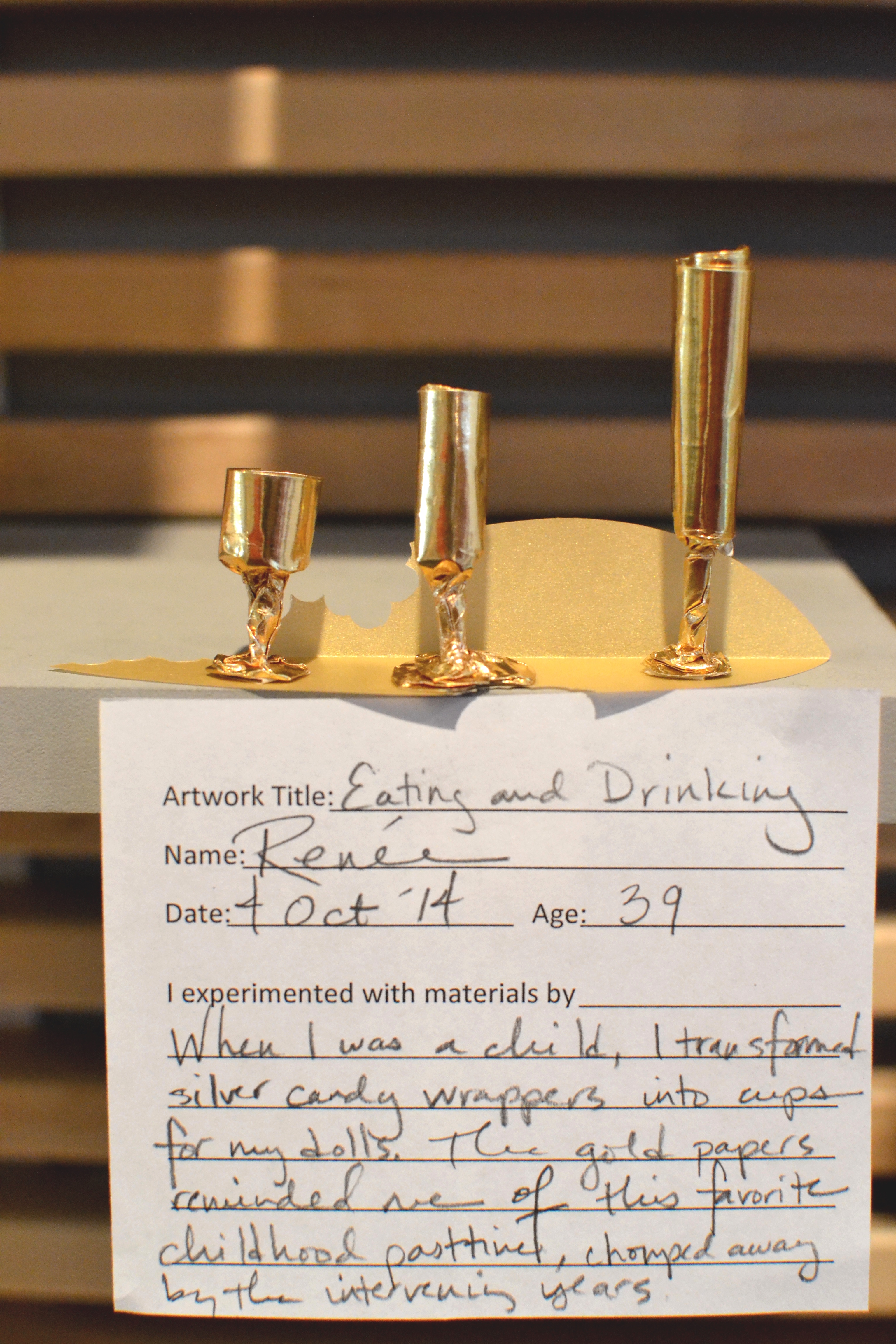 Aside from drawing-based activities, the Center for Creative Connections also has a drop-in art making area with large communal tables called the Art Spot, which we say is the place for “anytime art-making for everyone.” We invite visitors to explore their creativity by making creations out of unexpected or everyday materials. Every two months we change the materials and provide a prompt to inspire ideas. Each time I’m hesitant and wonder, “What will people make with this?” But, I am always delighted and surprised by the imaginative creations that are made and left behind. Children often come to C3 and head straight for the Art Spot, while adults can be a bit more tentative. However, regardless of age, most visitors stay anywhere from 5 minutes to two hours, with an average of about 20 minutes. Once they gather their materials they become immersed in their creation. For some it is a hands-on problem solving activity while for others it is about manipulating materials. How can you combine these objects (cups, spoons, paperclips, wire, egg cartons, cardboard, etc.) into something unique and surprising? This kind of open-ended activity, reminiscent of childhood playing and pretending, is not often made available to adults. I frequently watch my eight-year-old daughter take something like a toilet paper roll and turn it into a piano for her dollhouse, or repurpose a cardboard box to make an enormous rocket ship. This nostalgia for childhood play was brought perfectly into perspective by a recent Art Spot creation.