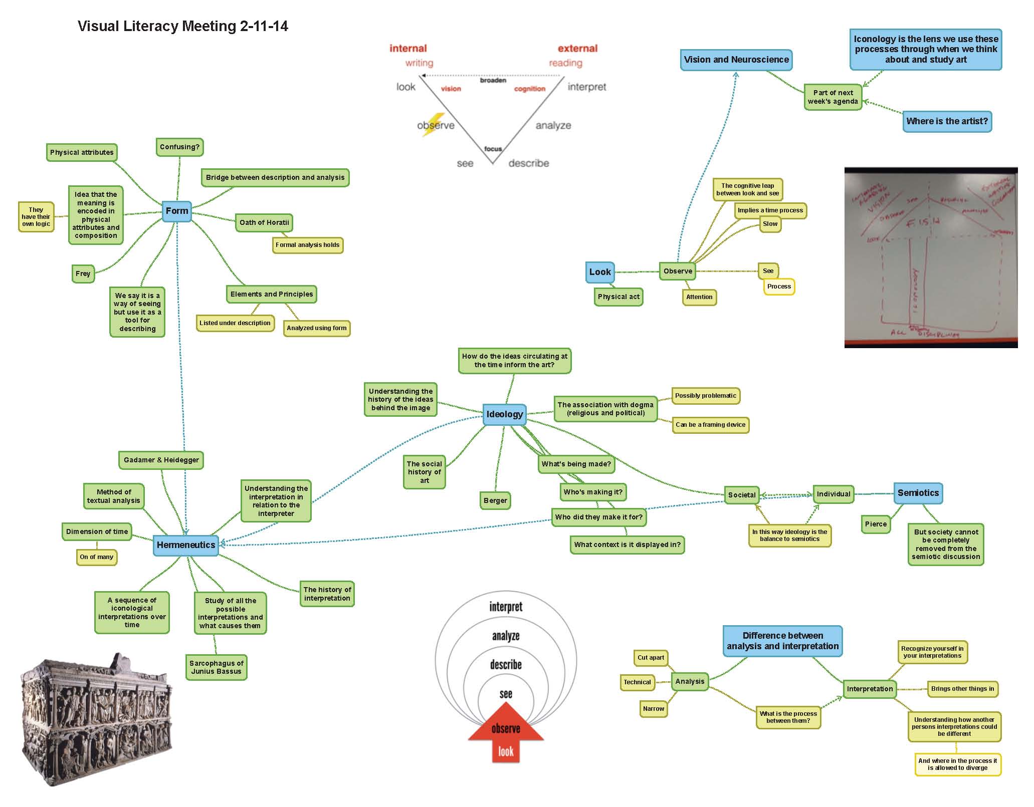 We had been incorporating visual literacy concepts into programming in a number of ways since 2010, but those programs largely lived with the education department. To be successful on this project, it was clear that it was essential to engage a variety of staff members outside of education in order for the concepts to “stick” and be embodied throughout the organization. Aided by strong support from the director’s office, we pulled together a cross-departmental team of 14 staff, for three consecutive Tuesdays in February 2014, to brainstorm around visual literacy concepts. This team consisted of staff from curatorial, education, library, marketing, visitor engagement, visitor services, and the director’s office.