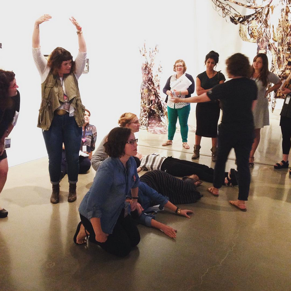 Because this was the first regional gallery teaching experiment and we knew we were asking some participants to step out of their comfort zones, we wanted to provide an opportunity for reluctant participants to observe first, and join the experimentation later in the day if they felt inspired. After lunch we repeated the format of the morning with a shorter planning period. Groups devised experiences for us to embody art, create stories, explore process, and look in refreshing ways.