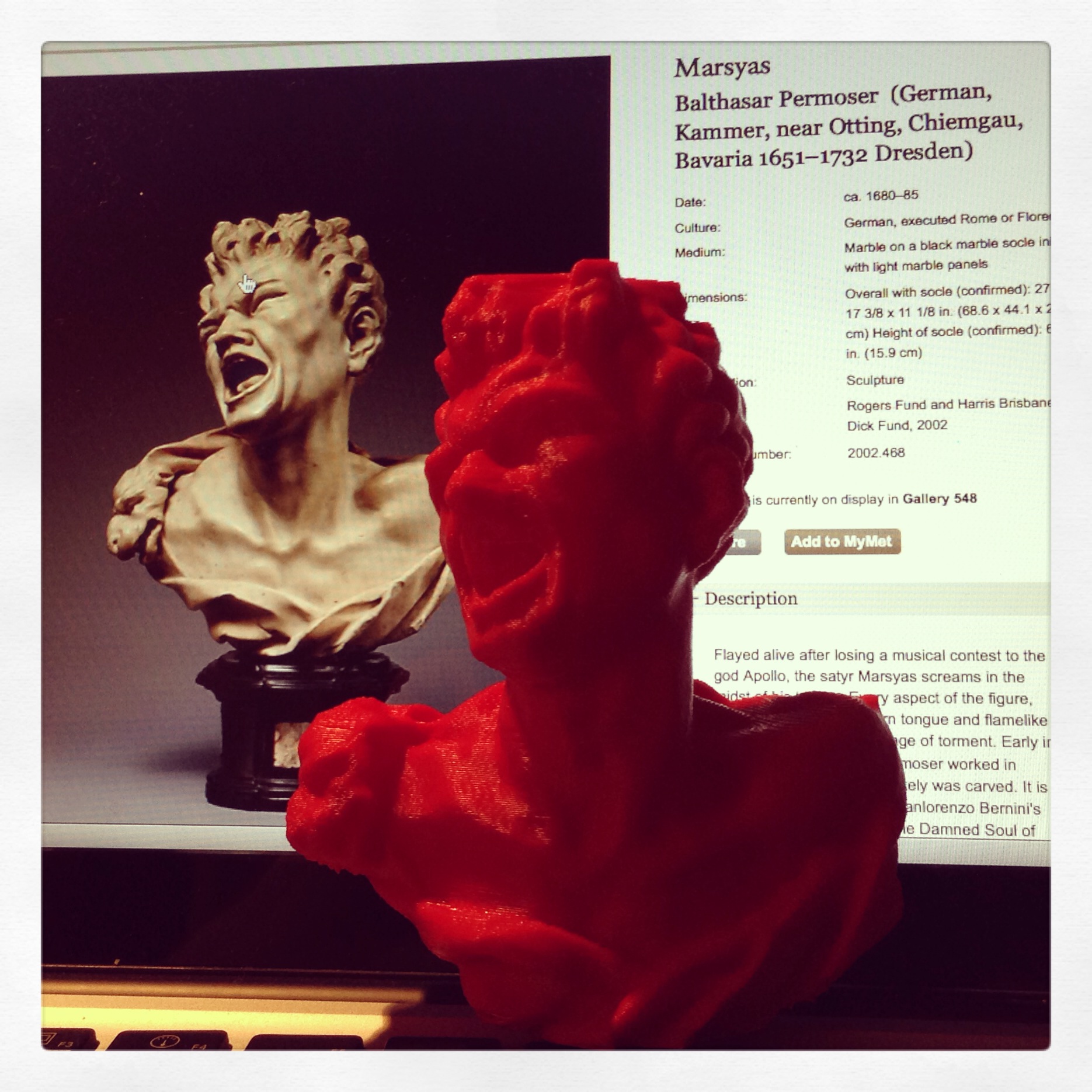 I could not agree more, and this has made me so excited to experiment with some workshops here at the Portland Art Museum around these technologies, and ensure that the museum can be a place for open creative exploration. And, besides, now I have my very own 3D-printed replica of the Met’s sculpture of Marsyas by 17th-century German sculptor Balthasar Permoser … what could be cooler than that! Obviously, there will be more discussion coming up on this site around 3D printing and museums, especially the impact this type of work might have in the teaching and learning realm of the museum. But I would encourage everyone to learn more about what the Met has been doing, and check out the objects and the 123D Catch scene files you can download to make your own replicas.