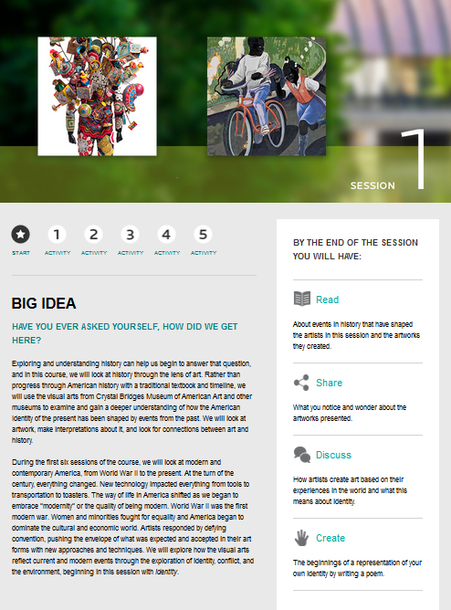 After an RFP process, we selected Education Development Center, Inc. (EDC) as the development partner. Over the course of a year, a cross disciplinary team of museum educators, instructional designers, subject-matter experts, graphic designers, and programmers, developed Museum Mash Up: American Identity through the Arts. Rather than progress through the artworks chronologically, the course begins with contemporary art. The guiding questions ask students “How did we get here? And how have artists shaped and reflected upon American identity?” Crystal Bridges partnered with Virtual Arkansas to offer and deliver the course. Like North Carolina Virtual, Virtual Arkansas is a supplementary provider of online courses that any public school student in the state can take. EDC and Crystal Bridges trained a few online arts instructors from Virtual Arkansas with volunteer students to test the activities and get formative feedback from both instructors and students.