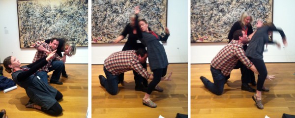 MAKING THE PAINT COME ALIVE THROUGH SOUND: Exploring Pollock’s canvas through sound originated in my own heightened interest in Pollock’s own passion and association with jazz music. Lee Krasner once remarked that Pollock thought that jazz “was the only other really creative thing that was happening in this country.” For the next phase of this workshop, we turned the gallery into a ‘sound lounge,’ breaking into small groups and experimenting with the spectrum of sounds we could create with just our bodies and the stuff in our purses, bags, and pockets. Each group was asked to create a sound composition in response to the painting. This ‘found sound’ exercise became a way of pulling out the basic structures of the painting that have a relationship with our sense of perceiving rhythms, tempos, and more improvisational structures embedded in the paint.