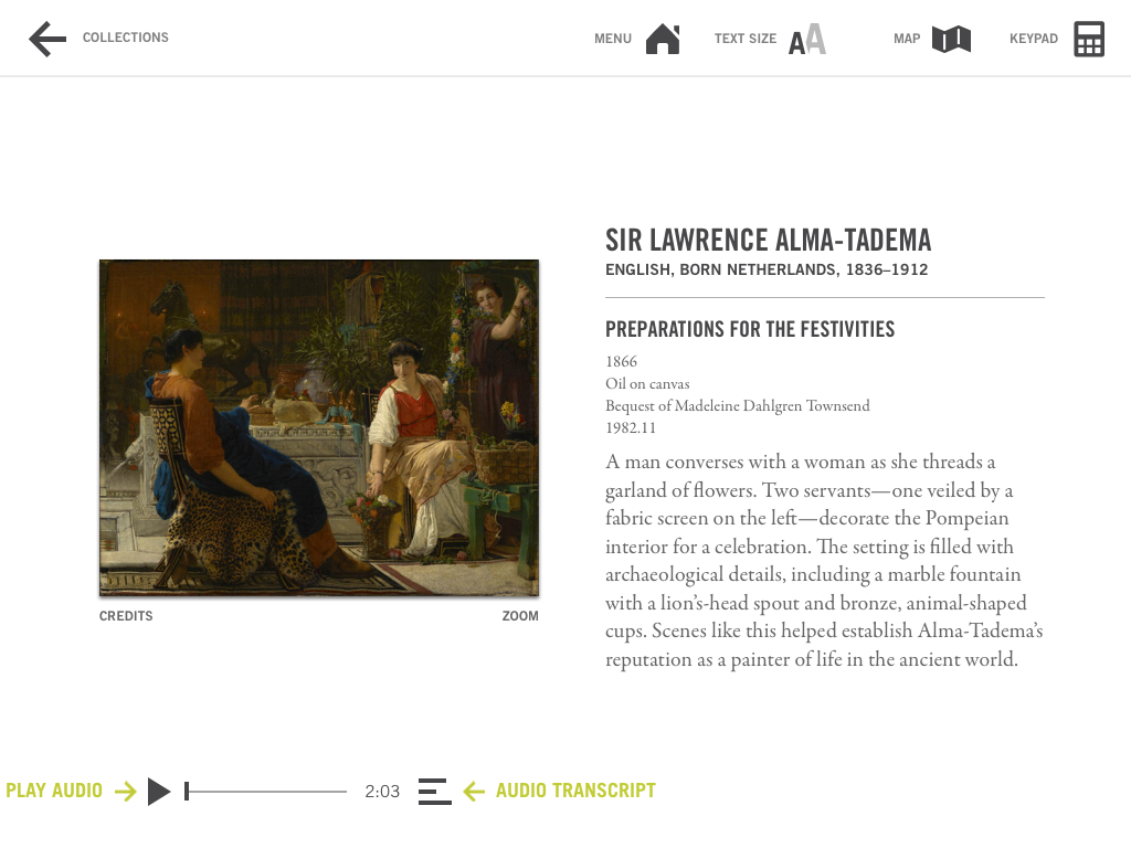 “Open collections” is a museum technology term that refers to a museum (or more appropriately, a GLAM—gallery, library, archive, or museum) “opening” all of collections data for anyone to freely use, reuse, or distribute it. In this context, data refers not only to an image of an artwork in a collection, for example, but all of an object’s “metadata” or supporting information, such as artist, time of creation, subject matter, size, medium, and so on. If the collection of your museum is digitally open, you release an API (application programming interface) that allows programmers to easily pull that data into lots of different contexts, such as websites or apps. The idea, according to the OpenGLAM movement, is that it allows “users not only to enjoy the riches of the world’s memory institutions, but also to contribute, participate and share.” (For a more in-depth explanation of museum APIs, check out this blog post from the SFMOMA Lab.)